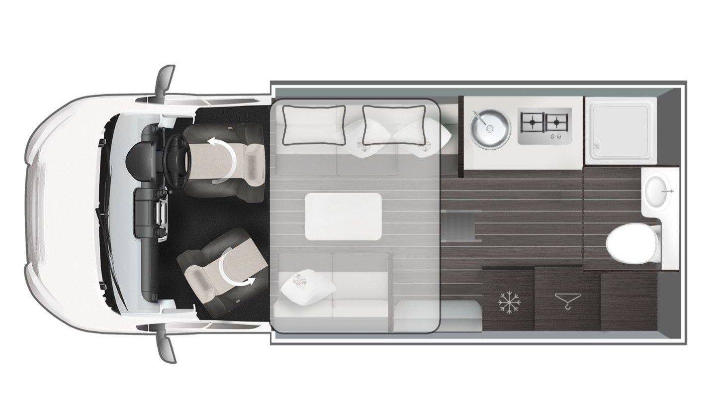The Como is the go-to motorhome for couples on our hire fleet. Its modern build makes the exterior much smaller than other motorhomes, allowing driving to be easy, even for leisure vehicle newcomers.