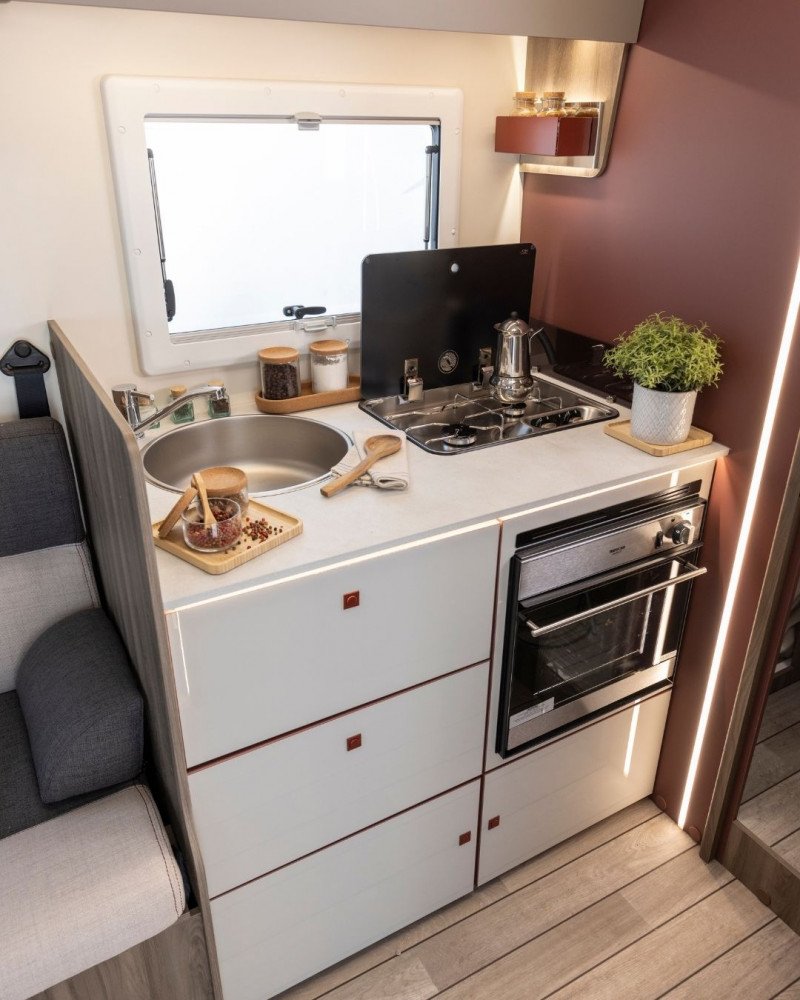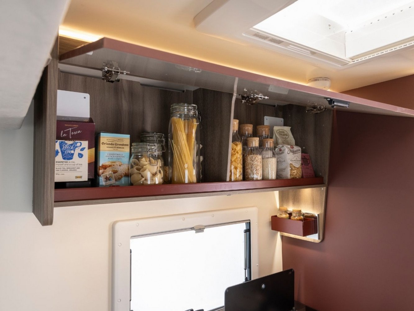 And despite this compact build, you’ll still find a spacious, luxurious interior, packed full of modern features. This is shown perfectly with the electric-drop down double bed: you may not even notice it when you first step in, but at the push of a button the wide and comfortable sleeping area will come down from the ceiling. You can easily get a good night’s sleep in the Como, and then tuck it back away in the morning.