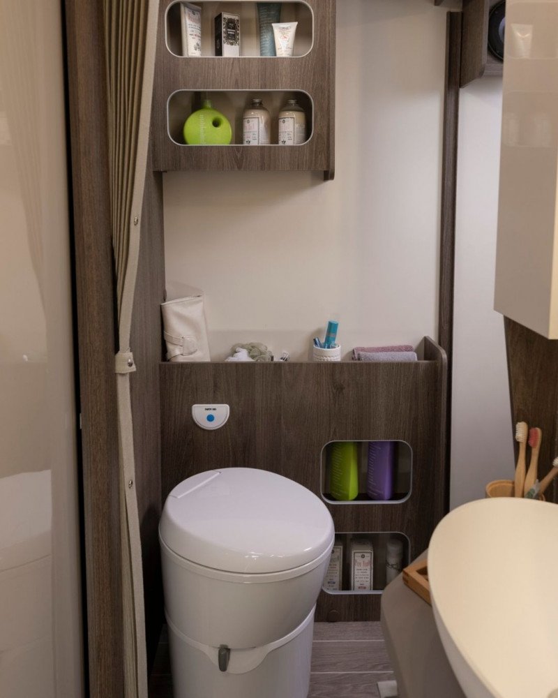 Venture near this bed, and you’ll find yet another unique luxury feature. The Da Vinci has a split central washroom, giving the toilet, shower and sink each of their own areas, and making the motorhome feel that much more spacious. And to top this off, there’s a sliding door separating it from the main dinette area. This lets the washroom and rear bed be in their own private, secluded area, and gives passengers the feeling of being in a lavish home or hotel.