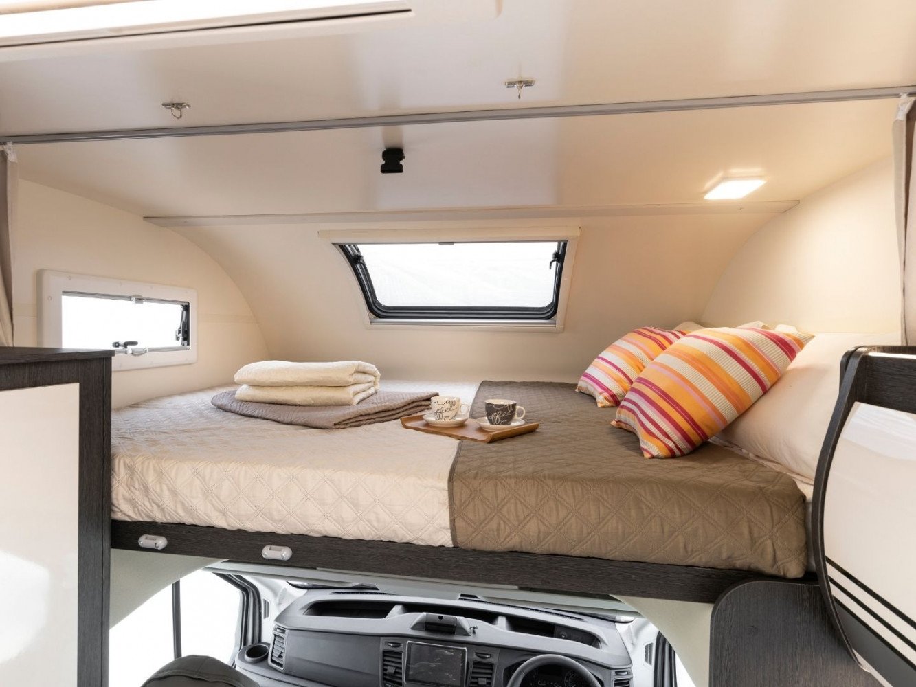 You’ll also find a fixed over-cab double-bed above the driver seats, tucked away but containing a surprising amount of space. This type of bed is great for couples to get their own secluded area of comfort. And despite having such a wide range of choice of beds, they’re also among the easiest to setup across our hire fleet. After a long day travelling and exploring, these fixed beds will be ready for you with minimal effort, and let you easily get a comfortable night’s sleep.