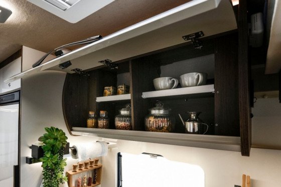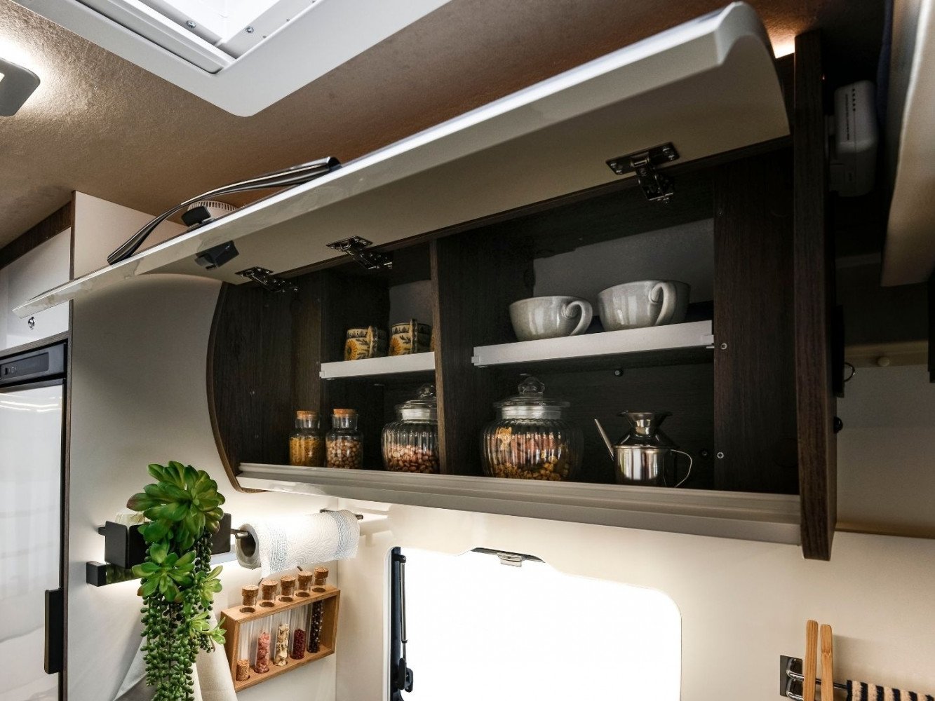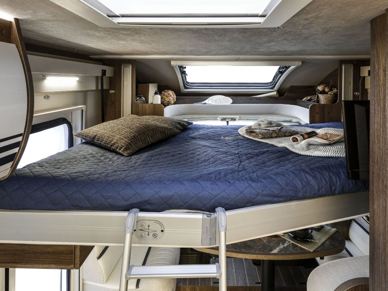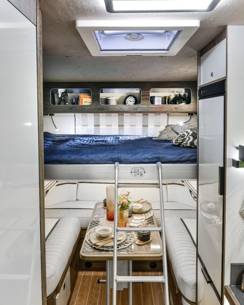 - Two drop-down double beds – one over the rear lounge and one over the front dinette